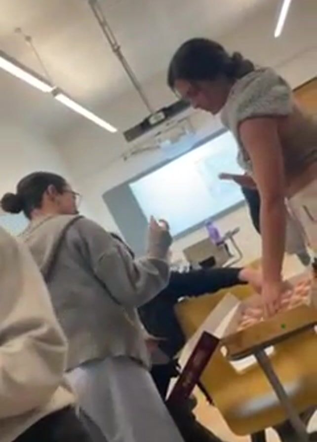 In a brightly lit classroom, several young women are gathered around a box of donuts on a student desk