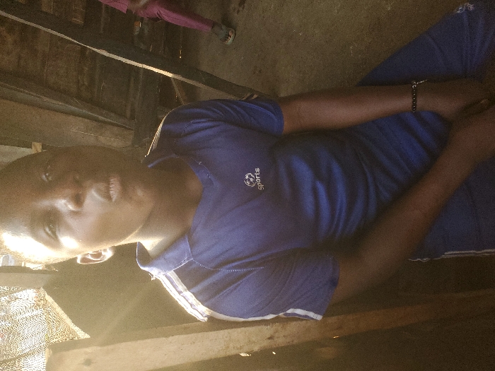 A person wearing a blue "Sports" shirt is seated. One arm is visible with a beaded bracelet on the wrist. In the background, there is rough-hewn wood, some type of wire netting, and another person is standing in the background. The lighting is dim and appears to have a glare.