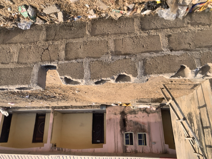 A building exterior is seen from an elevated perspective. A concrete block wall with gaps along the top edge dominates the upper portion. Below, a series of rooms or apartments with dark doors are visible. A pink wall with a small window and streaks is present. To the right, a ladder rests against the building, casting a shadow. Debris and trash are scattered along the top of the wall.