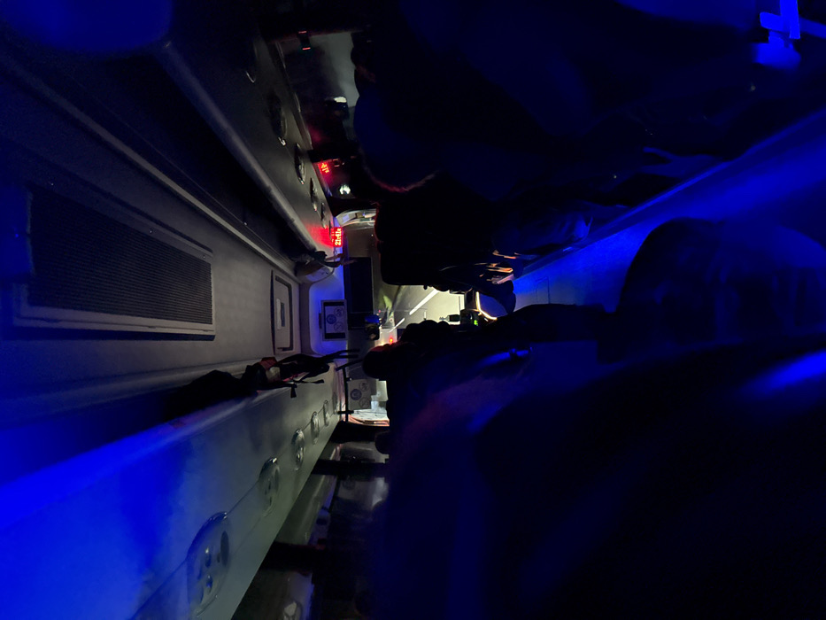 The image depicts the interior of a passenger bus, viewed from a rear-facing perspective looking forward. The environment is dimly illuminated by prominent blue LED strip lighting along the ceiling and floor, creating a nocturnal atmosphere. Silhouetted figures of multiple passengers are visible, seated in rows on both sides of a central aisle. Overhead storage compartments, air vents, and reading lights are discernible along the ceiling. Towards the front of the bus, a red digital display indicates "21:41," and a screen with a graphic is visible above the driver's area. Through the front windshield, a dark road at night is visible, illuminated by the bus's headlights, showing white lane markings. The bus appears to be in motion. This interior scene is located in Saint-Crépin-Ibouvillers, France.