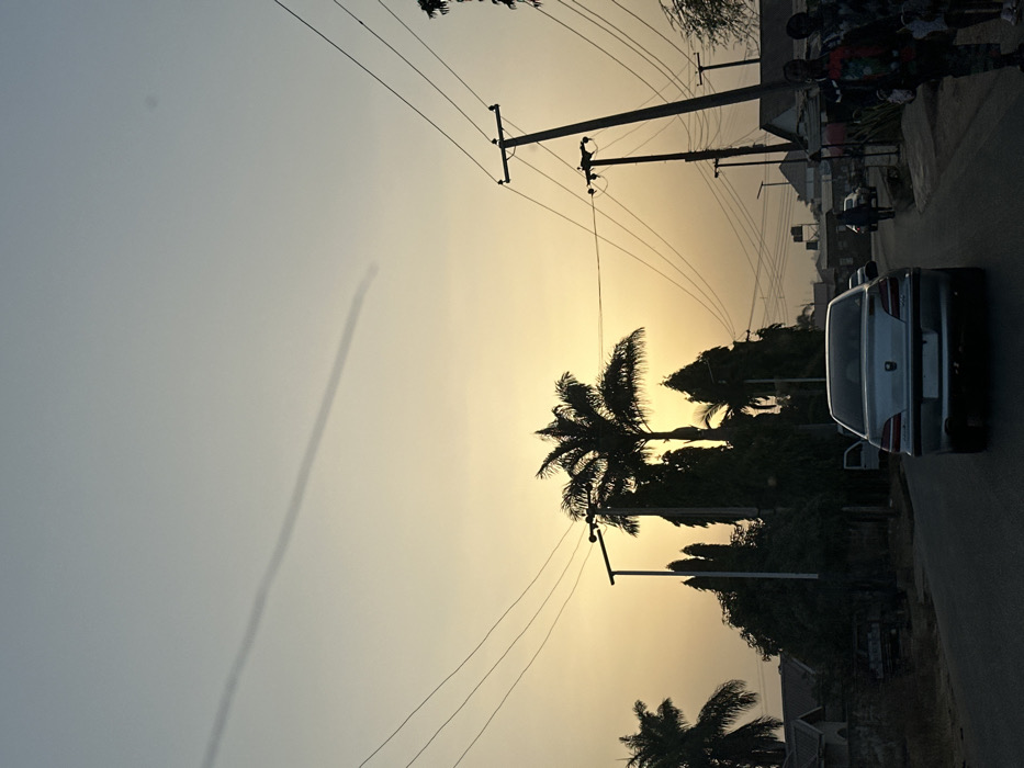 An image captures a street scene at sunset. Silhouetted palm trees and power lines contrast against the orange sky. A light-colored car is parked on the side of the road, and a group of people stand further down the street. The perspective is tilted, giving a slightly skewed view of the landscape. A faint contrail is visible in the upper left corner of the sky.