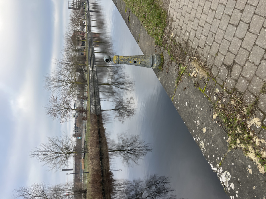 The image captures a segment of the Canal de Roubaix in Roubaix, France, under a heavily overcast sky. The foreground features a concrete canal bank, discolored with white and green lichen and moss, bordered on the right by a cobbled footpath. Organic debris, including dried grass and light-colored fibrous material, is scattered along the seam between the concrete and cobblestones. A weathered, grey metal bollard, approximately one meter tall, stands on the concrete bank, exhibiting significant surface wear, green and white biological growth, and two irregular holes on its side, with a smaller circular aperture on its rounded top. The midground is dominated by the calm, dark water of the canal, which perfectly reflects the bare, skeletal branches of deciduous trees lining the opposing bank, as well as the overcast sky. The far bank consists of a grassy strip bordered by a concrete retaining wall, behind which numerous leafless trees are visible. In the distant background, under the muted sky, an urban and industrial landscape unfolds. Prominent features include a tall, slender industrial chimney on the left, various low-rise buildings, some exhibiting signs of construction or disrepair, and a pedestrian bridge further down the waterway. No human figures or active elements are present within the depicted scene.