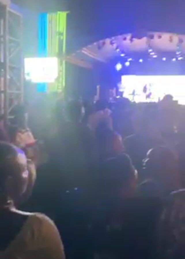 large crowd gathered to watch a performance on a brightly lit stage. The audience is dense and diverse, with people of different ages and ethnicities visible. Many are holding up phones to record the event. The stage features a large screen displaying the performers, who appear to be dancing. The environment seems to be a concert or festival setting, with lighting structures and possibly a tent overhead. The overall atmosphere is energetic, with the audience likely enjoying the performance.