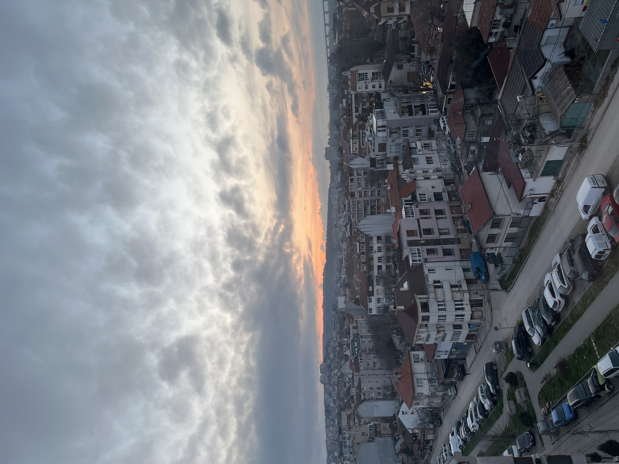 - "This image presents a high-angle, wide-view perspective of a densely populated urban area in Varna, Bulgaria, during either sunrise or sunset, as indicated by the band of orange and pink light visible on the eastern horizon beneath an overcast, mostly grey sky" by FM-m7eye2, licensed under CC BY 4.0