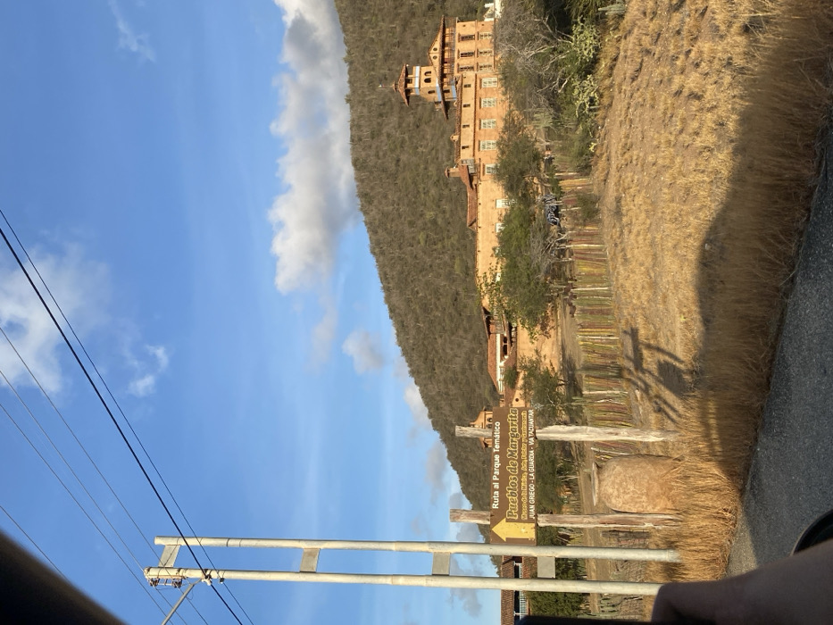 An outdoor scene captured from a vehicle displays a dry, hilly landscape under a blue sky with scattered white clouds. The primary subject is a complex of light-orange colored buildings situated on a terraced hillside. The most prominent structure is a multi-story building featuring a red-tiled roof and a tall, octagonal tower with a blue-domed top, positioned on the right. Additional buildings with similar architectural styles are visible to its left and behind. In the mid-ground, a wooden directional sign points right, displaying text: "Ruta al Parque Temático" (Route to the Thematic Park), "Pueblos de Margarita" (Villages of Margarita), "Museo de la Música, Arte, Folklore y Costumbres" (Museum of Music, Art, Folklore and Customs), and "JUAN GRIEGO - LA GUARDIA - VIA TACUANTAR." This indicates the location is near Juan Griego, Venezuela, specifically leading to the Pueblos de Margarita thematic park. The foreground consists of dry, golden-brown grass. A rustic fence made of multi-colored vertical wooden stakes separates the grassy area from the hillside leading to the buildings. A large, weathered ceramic urn or pot rests in the grass near the sign. A tall, two-legged utility pole with overhead power lines stands on the far left. The background is dominated by a large hill covered in sparse, dark green and brown scrub vegetation. A human hand is partially visible in the lower left corner, suggesting the photograph was taken from inside a vehicle. Distinct shadows are cast across the foreground and hillside, indicating direct sunlight from a low angle.
