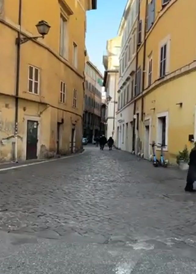 narrow, cobbled street in Rome, Italy. The buildings on either side are tall and closely packed, painted in warm shades of yellow and beige. Some have window shutters. Several people can be seen walking down the street, mostly in dark clothing. Graffiti is visible on a green door on the left. The sky is blue and the sun is shining, casting shadows down the street. There is a scooter parked on the right side of the street. The camera pans slightly upwards and follows the people walking away.