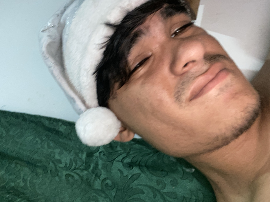A selfie features a dark-haired man wearing a festive white hat with a pom-pom