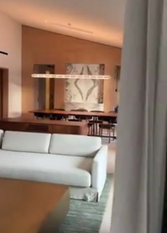 The video starts inside a modern, well-lit room. It contains a large white sofa, a wooden coffee table on a green rug, a long wooden table with chairs underneath a rectangular light fixture, and a piece of art on the wall. The camera moves towards a curtain and then reveals a long balcony with yellow walls and a wooden ceiling. There are several small wooden tables with chairs on the balcony. The video ends with a panoramic view of a calm lake surrounded by mountains under a cloudy sky.