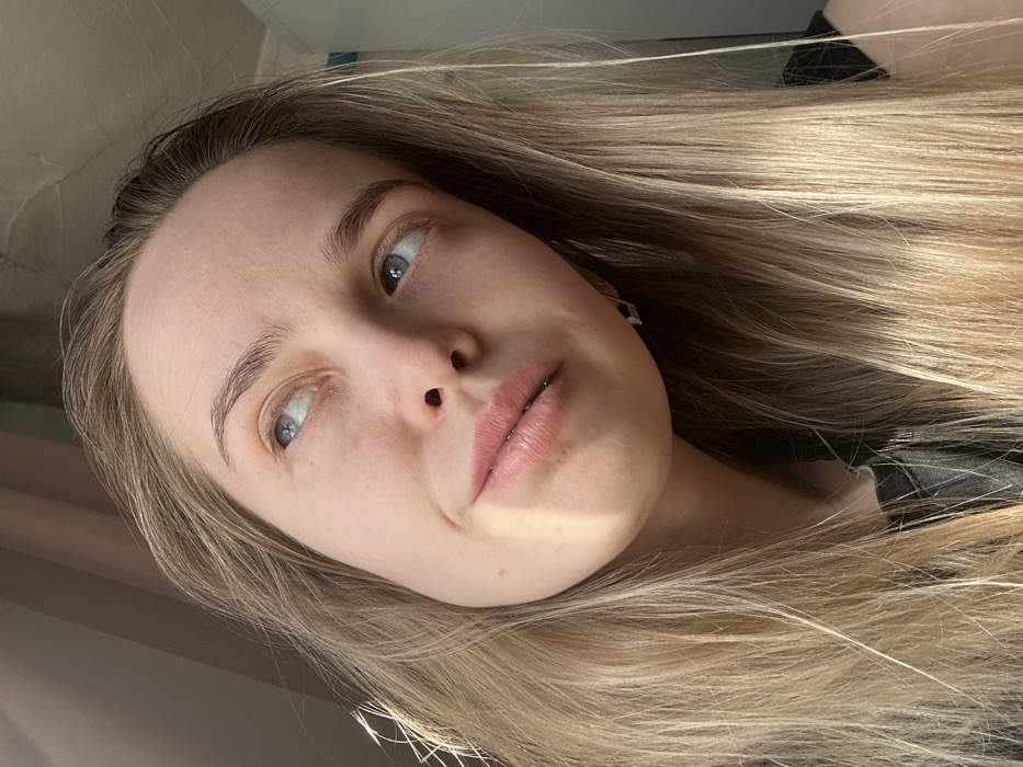 The image depicts a close-up, angled portrait of a single female individual within an indoor setting in an indeterminate location in the city of Азинский, Russia. The subject is a light-skinned female with long, wavy, blonde hair that frames her face and extends out of frame. She has blue eyes, light brown eyebrows, and full, slightly parted lips. Her gaze is directed upwards and to the viewer's right. A band of natural light, likely sunlight, illuminates the left side of her face (viewer's right), her chin, and portions of her hair and chest, creating a distinct shadow line across her lower face. A small, silver-colored, geometric-shaped earring is visible on her right earlobe (viewer's left). She appears to be wearing a dark, possibly black, garment, partially visible at the bottom of the frame. The background is out of focus, revealing a soft, light brown or pink curtain on the upper left and a lighter, possibly off-white, wall or object on the upper right. No other individuals or specific identifiable objects are clearly visible.