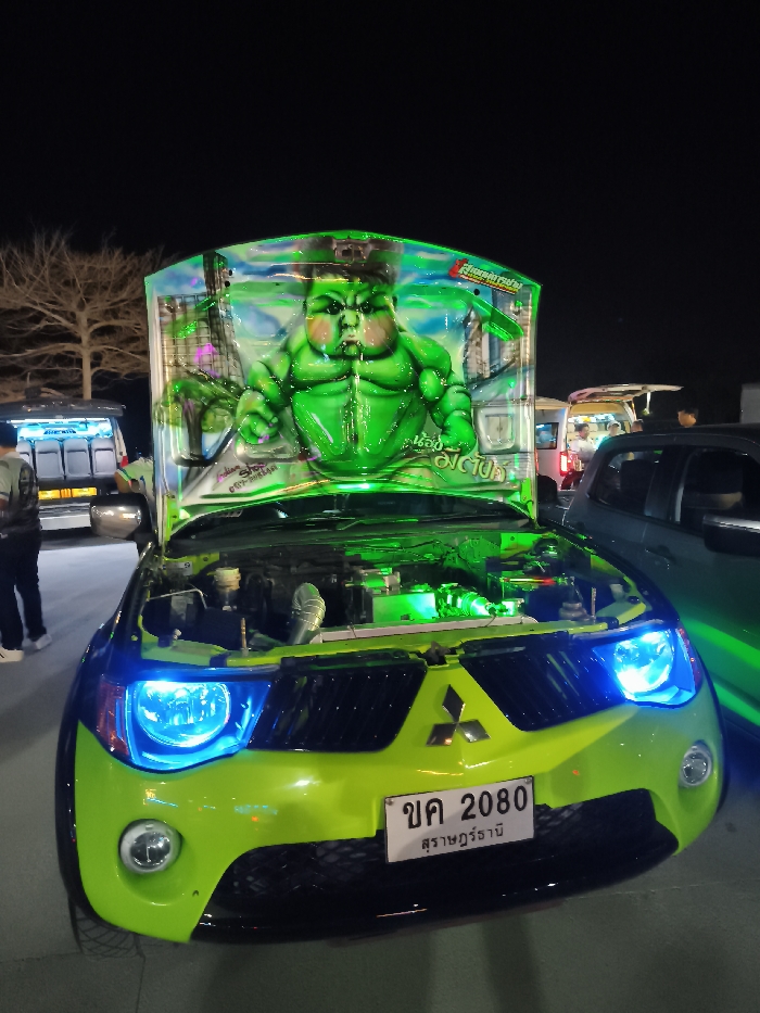 - "A highly customized lime green and black Mitsubishi Triton pickup truck is prominently displayed outdoors at night in บ้านบางรักษ์, สุราษฎร์ธานี, Thailand" by FM-H4hzl2, licensed under CC BY 4.0