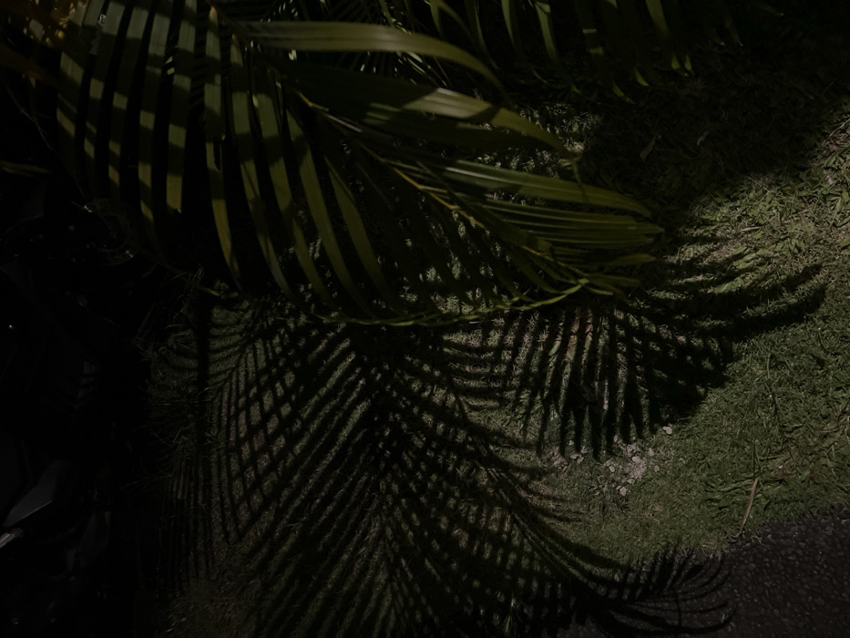 The image displays an outdoor, nighttime scene in Munggu, Indonesia. A strong, artificial light source illuminates a patch of green grass and several dark green palm fronds. The dominant visual element consists of numerous sharp, linear, and lattice-like shadows cast by palm fronds onto the grass, occupying the central and left areas of the frame. Live palm fronds are visible on the right side, showing partial illumination and visible venation. The upper-left background is characterized by deep shadow, with an indistinct reflective surface barely visible in the extreme upper-left corner. No individuals or animals are present.