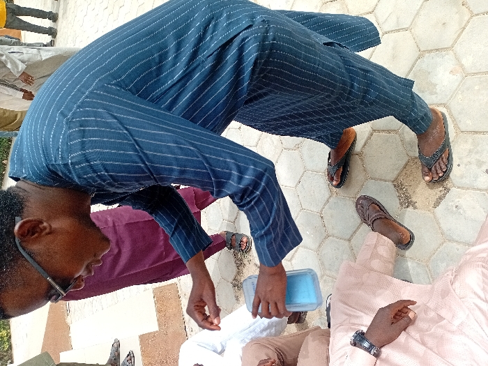The scene takes place outdoors in Kwazailewa, Nigeria, on a light-colored hexagonal tiled ground. A dark-skinned male subject, wearing black-framed sunglasses, a dark blue traditional garment with white vertical pinstripes, and black flip-flops, is bent over, looking down. He holds a clear plastic rectangular container containing a light blue liquid in his right hand. His left hand is positioned above the extended left hand of another male subject, who is partially visible, seated or kneeling on the ground. This seated subject wears a light beige traditional garment, a dark-faced wristwatch on his left wrist, and one dark brown leather slipper is visible beside his bare foot. Other indistinct individuals are present in the blurred background, including one wearing a dark maroon garment and another in a light-colored garment.