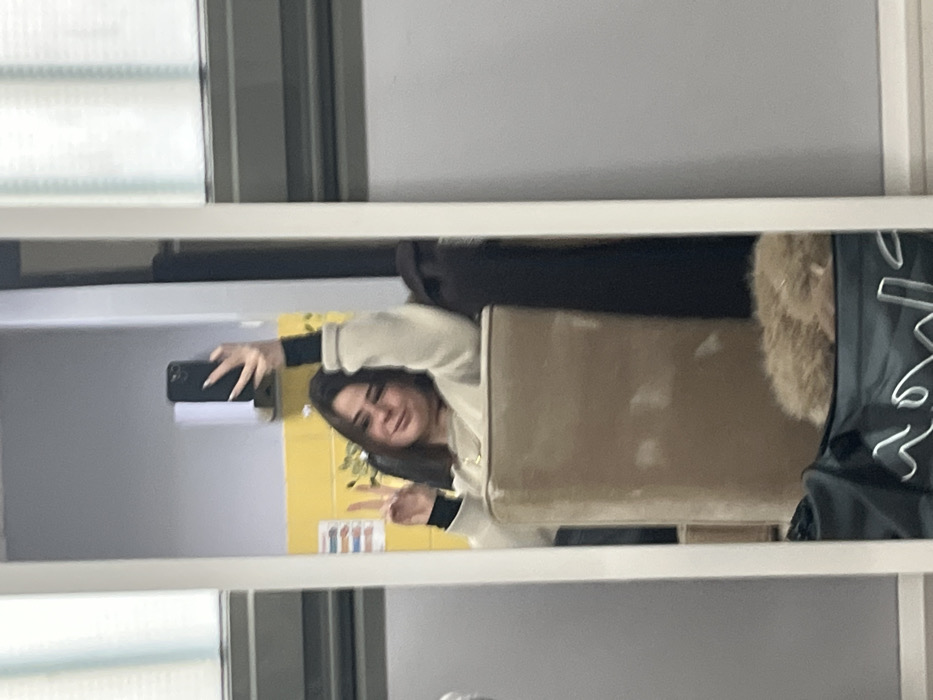 A female individual is depicted in a mirror selfie taken within an indoor location in Saint-Amand-les-Eaux, France