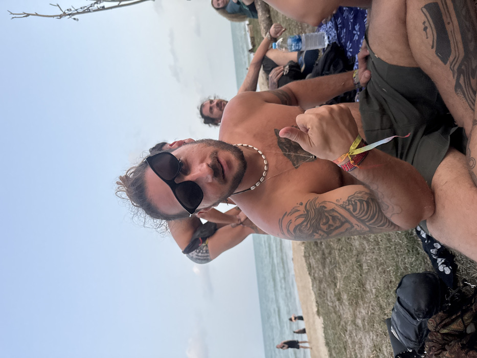 The scene depicts a casual gathering on a beach in Ban Pang Pring, Thailand. In the foreground, a shirtless male subject, appearing to be of adult age, is seated on the ground, looking directly at the camera. He has dark hair styled in a bun, a beard, and wears dark sunglasses. A white shell necklace is around his neck. His right arm is bent, and his hand displays a thumbs-up gesture. Multiple colorful wristbands are visible on his right wrist. Tattoos are present on his left upper arm (a skeletal or flowing figure design), chest, and right thigh (a boat on water). He is wearing dark green shorts. A black bag rests on the ground to his left. In the midground, to the left of the main subject, another individual is seen bending over, facing away from the camera, wearing dark shorts with a light pattern and a visible leg tattoo. To the right of the main subject, another male is seated, looking towards the right, with a beard. A clear plastic water bottle is on the ground near him, alongside a blue patterned fabric. A partial view of a third seated individual is visible further right. In the background, the ocean shoreline is visible with gentle waves. Several indistinct figures are present on the sandy beach near the water's edge. The sky is light blue with minimal cloud cover. A thin, bare tree branch or post with small lights or decorations is visible on the far right. The ground transitions from sand near the water to a sparse grassy area where the individuals are seated.