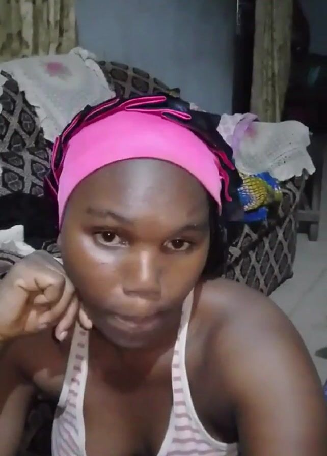A young dark-skinned woman with a pink head wrap poses for a selfie, looking directly at the camera with a serious expression. She is wearing a white and light pink striped tank top and resting her chin on her right hand. Behind her is a cluttered area with a patterned chair, draped with white and patterned fabrics. The room is dimly lit with a glimpse of curtains in the background.
