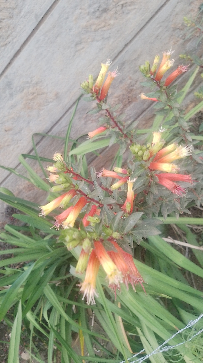 An orange-red and yellow flowering plant stands next to slender green leaves. The flowers are tube-shaped with white stamens protruding. The plant has small, dark green leaves. A textured grey wall is in the background. The flower appears to be in a garden or natural setting. Some wire is visible in the lower right corner.