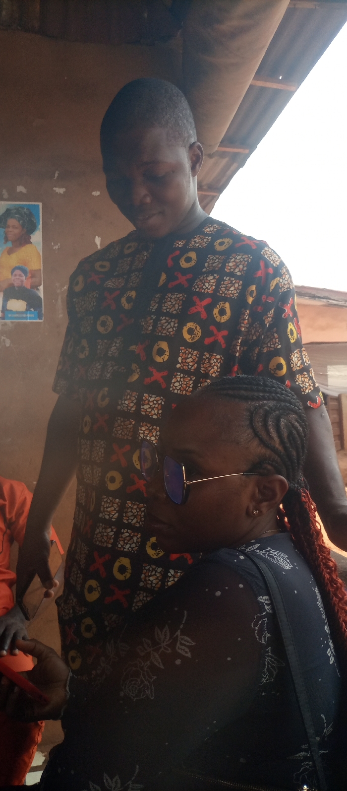 The scene takes place in an indoor or sheltered outdoor area in Unknown, Unknown. Two dark-skinned individuals are present. A male, positioned centrally and standing, wears a dark, short-sleeved shirt patterned with yellow circles, red crosses, and beige geometric shapes. He has a short haircut and looks downwards towards the foreground. His right hand holds a small red object. To his left, a light brown wall displays two faded posters of women. Above, a corrugated metal roof is partially visible, indicating a basic structure. In the foreground, a female is seated, facing right and slightly away from the camera's direct line of sight. She wears blue-tinted reflective sunglasses, a dark top with a white floral pattern, and her hair is styled in cornrows transitioning to red-orange braided extensions. Her left hand holds a small red object. No direct interaction or eye contact is observed between the individuals; both appear to be independently occupied in a casually lit environment.