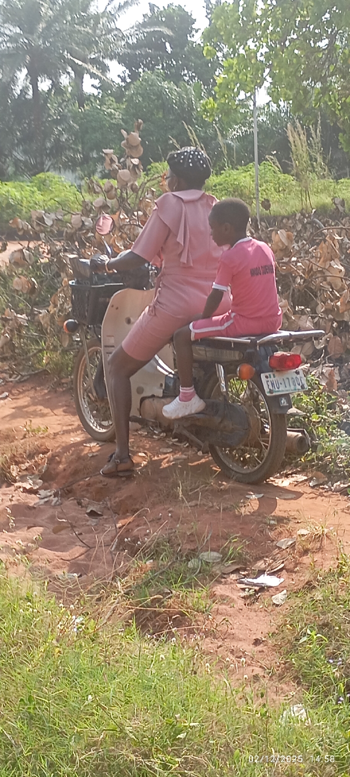 - "The image depicts two individuals on a white scooter-style motorcycle, observed from the rear, situated on an unpaved reddish-brown dirt road in Alor, Nigeria" by FM-sNCSU2, licensed under CC BY 4.0