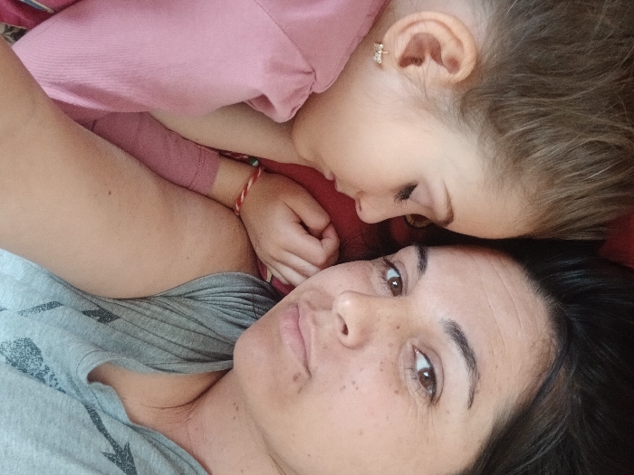 This image captures two individuals, an adult female and a young female child, in a close-up, vertical-format photograph taken indoors in Obrochishte, Bulgaria