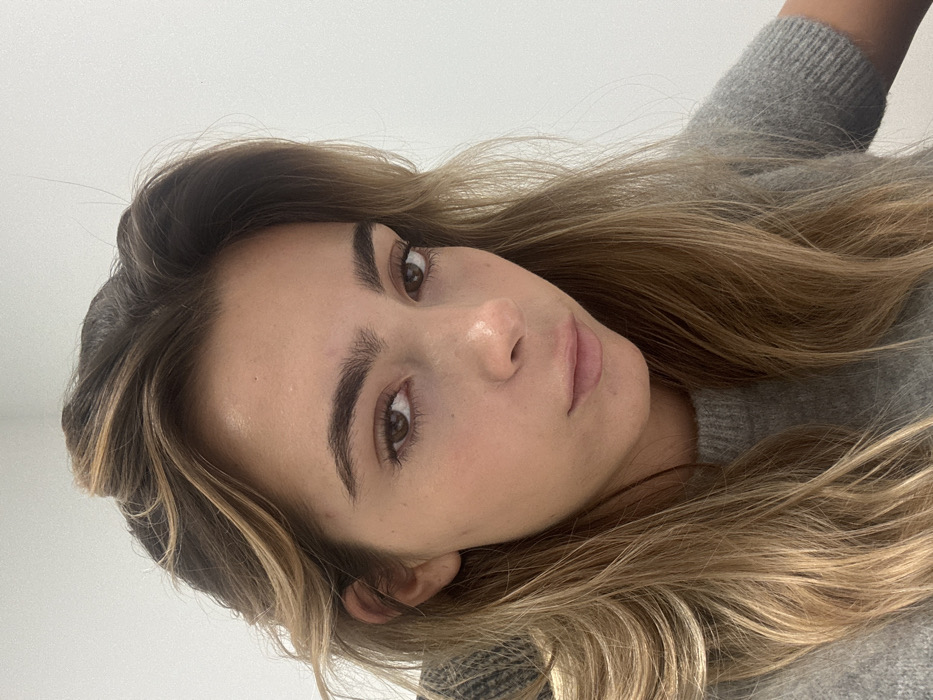 A young adult female is depicted in a close-up, chest-up portrait. She has long, wavy, multi-toned hair, predominantly light brown with blonde highlights, parted on her right side and falling over her shoulders. Her skin is light-toned. She possesses full, dark brown eyebrows and dark brown eyes, maintaining direct eye contact with the viewer. Her facial expression is neutral. She wears a grey, finely knitted, short-sleeved sweater. The background consists of a plain, light-colored wall, likely indoors. An indistinct dark object is partially visible behind her left shoulder. The specific location within the city of Unknown, Unknown, is not discernible.