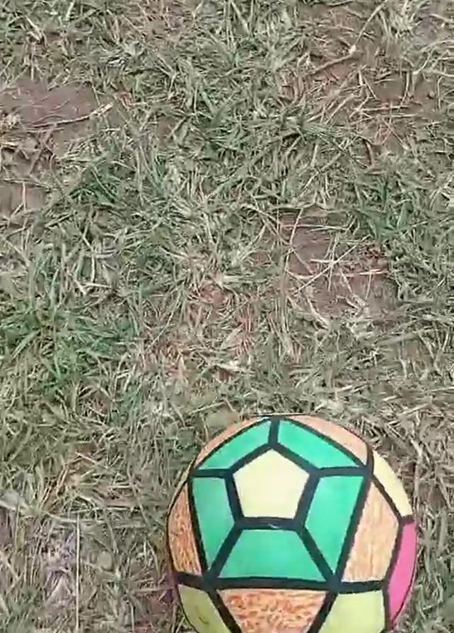 colorful ball on a grassy area. The ball has a pattern of polygonal shapes in different colors, including green, pink, yellow, and orange, outlined with black lines. The grass is mostly green, with some brown patches. The camera moves around the ball, showing it from different angles. There are no people visible in the video.