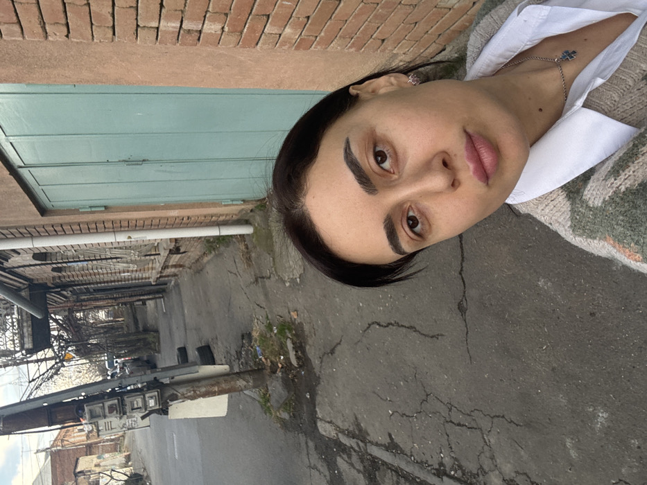 A female subject is centered in a close-up selfie, occupying the lower right of the frame. She has dark hair, dark eyebrows, light brown eyes, and her lips are a muted pink, slightly pursed. She wears a white collared shirt under a patterned cardigan in shades of green, beige, and grey. A silver-colored chain with a dark cross-shaped pendant is visible on her neck, and she wears small, silver-toned earrings. The background depicts an urban street in Tbilisi, Georgia. To the right, a brick building with light orange-brown mortar features a prominent light blue-green double metal door and a white vertical downspout. Further along this side of the street, an older brick building with arched window openings and a dark, ornate metal balcony is visible. On the left, a light brown utility pole stands slightly askew, fitted with at least four vertical electrical meters and numerous overhead wires. The ground consists of a cracked asphalt road and an uneven concrete sidewalk with scattered dry vegetation and debris. Two dark, circular objects, possibly tires, are visible on the sidewalk near the utility pole. In the distance, indistinct buildings and parked vehicles are present under an overcast sky. The scene is illuminated by diffused daylight.