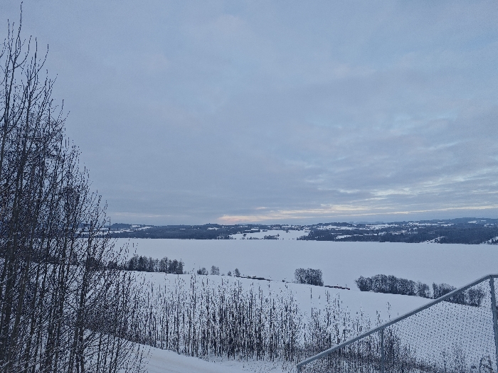 The image displays a panoramic winter landscape viewed from an elevated position in the city of Unknown, Norway. A vast, flat, snow-covered expanse, presumed to be a frozen lake or large field, occupies the midground. Beyond this, snow-dusted rolling hills and a distant treeline extend to the horizon. The sky is overcast with grey-blue clouds, exhibiting a subtle orange-pink glow near the horizon in the center-right, suggesting low sun or cloud illumination. In the immediate foreground, to the left, a dense cluster of bare, dark deciduous tree branches, lightly dusted with snow, partially frames the scene. To the right, a grey metal railing or fence with a mesh infill ascends diagonally from the lower right corner. Below the frozen expanse and between the foreground elements, a snow-covered slope is populated by numerous thin, dark, bare saplings or bushes. Scattered clusters of larger, bare trees are visible along the perimeter of the frozen surface. No individuals or discernible actions are depicted. The environment is characterized by heavy snow cover and overcast conditions.