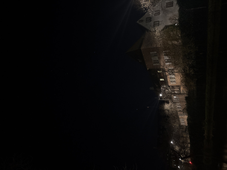 A nighttime view reveals a tall, old building with illuminated windows, ascending vertically on the right side. Streetlights punctuate the darkness, casting a glow on bare tree branches. Dark vegetation lines the right edge of the frame, contrasting with the expansive black sky filling the majority of the image. A faint red glow appears near the bottom right corner.