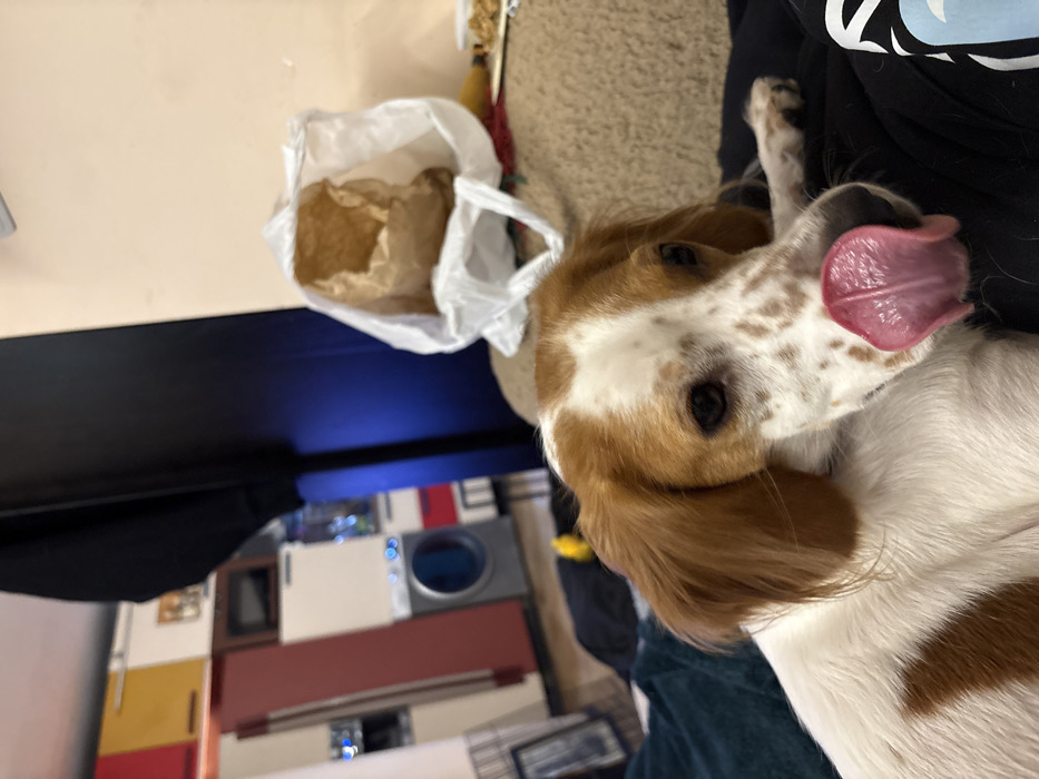 The image depicts a domestic interior located in Sofia, Bulgaria. A white and orange-brown spotted dog, consistent with a Spaniel type, occupies the foreground. The dog is observed licking its nose with its tongue fully extended. It rests on a dark fabric covering a light brown upholstered surface. To the right, a white plastic carry bag holds a crumpled brown paper bag. The background reveals a residential kitchen area featuring multi-colored modular cabinets in red, yellow, and off-white tones. Appliances visible include a microwave oven mounted above a counter, and a silver-colored front-loading washing machine with a blue illuminated drum. A tall, reddish-brown cabinet and another appliance with blue indicator lights are present on the far left. The walls are painted a light, neutral color. A dark, vertical structure, possibly a wall or large piece of furniture, stands on the right, emitting a faint blue light at its base.