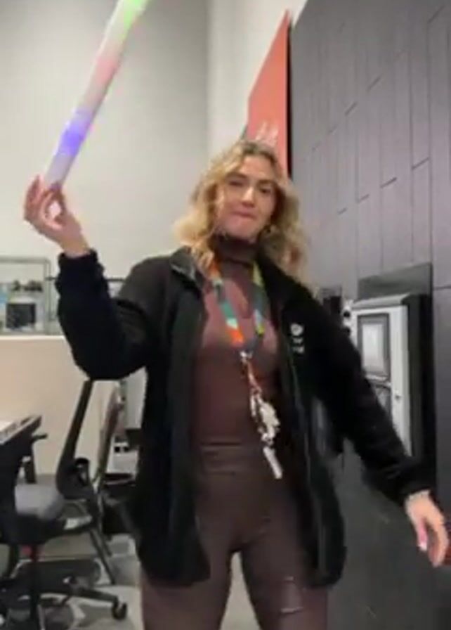 A woman with curly blonde hair is standing in an office space. She is wearing a brown turtleneck shirt, a black jacket, and brown pants. She also has a lanyard with a badge around her neck. In her hands, she holds a long, cylindrical object that appears to be illuminated with changing colors. She gestures with the object, then walks closer to the camera, waving. The background includes office chairs, a trash can, a wall with black panels and a digital display, a glass display case, and a plant.