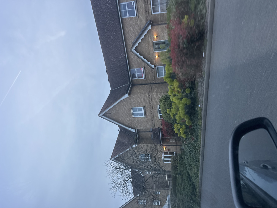 The image depicts a multi-story residential or institutional building located in the city of Gillingham, United Kingdom, viewed from a vehicle on an adjacent road under an overcast sky. The sky is a pale grey, with a faint contrail visible in the upper right quadrant. The building is constructed primarily of light brown or buff brickwork, featuring multiple gabled sections with dark grey tiled roofs. White-framed windows are visible across all visible floors, including some within the gabled dormers. Architectural details include stepped brickwork below several windows and along the edges of the gables. One upper-story window on the right side of the main gabled section emits a distinct pink light from within. Two illuminated entrances are visible. The most prominent entrance, positioned centrally, features a decorative gabled porch with light green double doors and two active wall-mounted sconces casting a warm light. Another entrance is visible further to the left, also with an active outdoor light fixture. A bare deciduous tree stands in front of the left-most section of the building, suggesting a cold season. The foreground consists of a dark grey asphalt road, separated from the building by a grey curb and a landscaped area. The landscaping features a dense array of shrubs, including dark green ground cover, brighter lime-green bushes, and reddish-brown foliage, indicating deliberate planting and maintenance. Small white fragments, possibly litter, are visible on the curb and the edge of the landscaped area. The lower-left corner of the image includes the black casing and reflective surface of a vehicle's side mirror, indicating the photograph was taken from inside a moving or stationary vehicle. No people or active interactions are visible within the scene.
