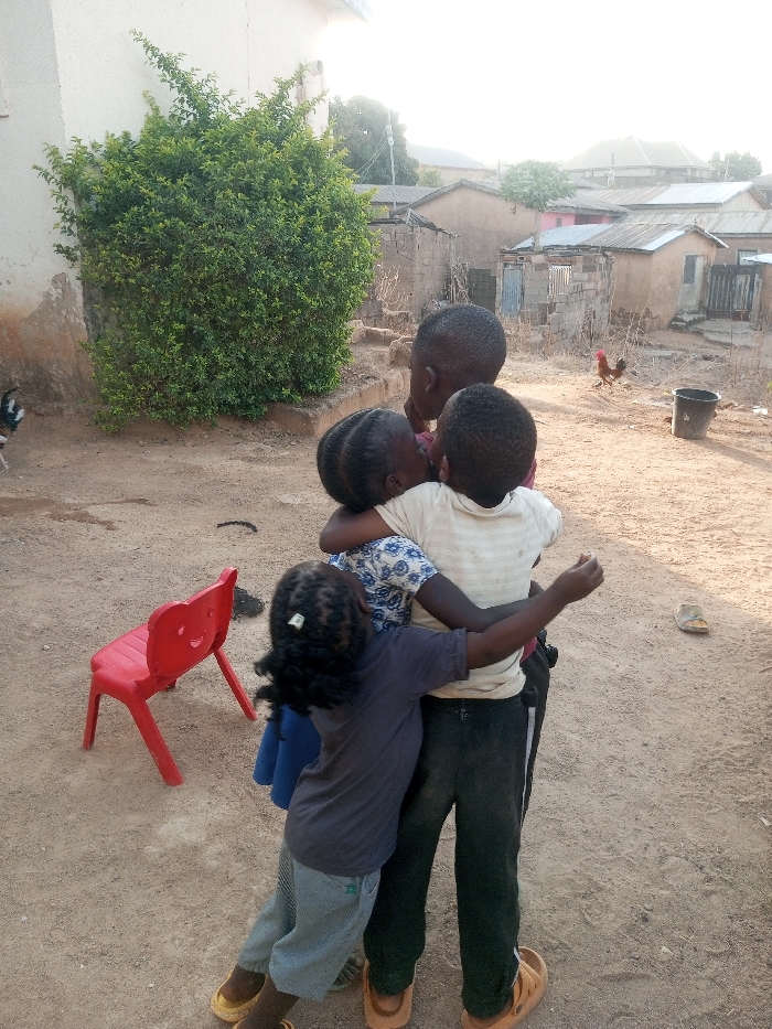 Four African children embrace tightly. A small red chair sits to the left on the sandy ground. Beyond them, simple buildings with corrugated roofs suggest a rural setting. A bush grows near a wall. A rooster stands by a black bucket in the distance, with a discarded sandal nearby. The children's clothes appear worn, and their shoes are basic sandals or clogs.
