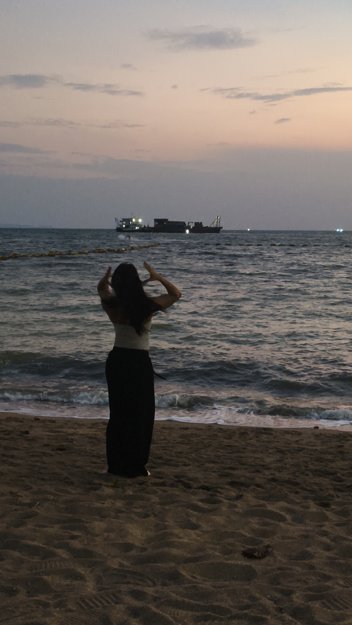 The image presents a forensic scene analysis from a beach in Pattaya City, Thailand, at dusk. A lone female individual stands on the dark sand in the foreground, facing away from the viewer and towards the sea. She wears a light-colored strapless top and long dark pants or a skirt, with long dark hair. Her arms are raised, hands positioned near her head. The sandy beach exhibits subtle undulations and minor debris. At the water's edge, small white-capped waves break. A line of yellow cylindrical buoys extends horizontally across the water in the mid-ground. Beyond the buoys, a large vessel, consistent with a dredge or workboat, is visible on the dark ocean, distinguished by multiple illuminated sections. The distant sky transitions from a faint orange-pink hue at the horizon to a muted grey-blue overhead, indicating twilight conditions. Several small, bright lights are visible on the distant horizon over the water.