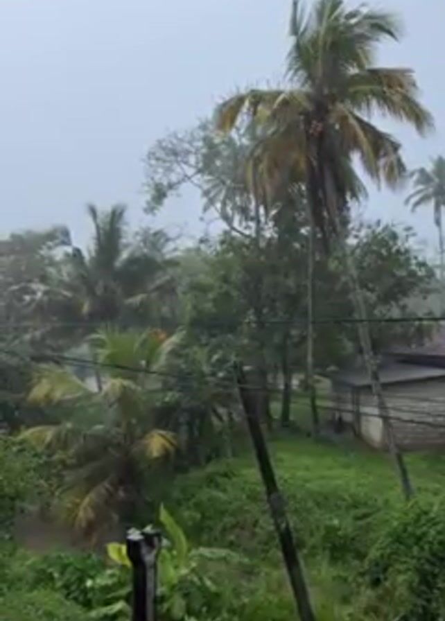scene with palm trees and other trees swaying in the wind during a heavy rain. There is a grey sky and the greenery appears lush and wet. Utility poles and lines are visible in the foreground. A small building is visible amidst the green vegetation in the background. The camera appears to be stationary, capturing the storm's impact on the trees and surrounding environment.