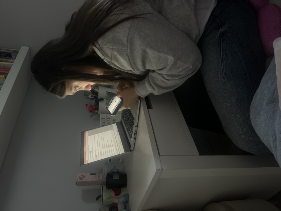 An individual, identified as female, is seated at a white wooden desk in a dimly lit indoor environment