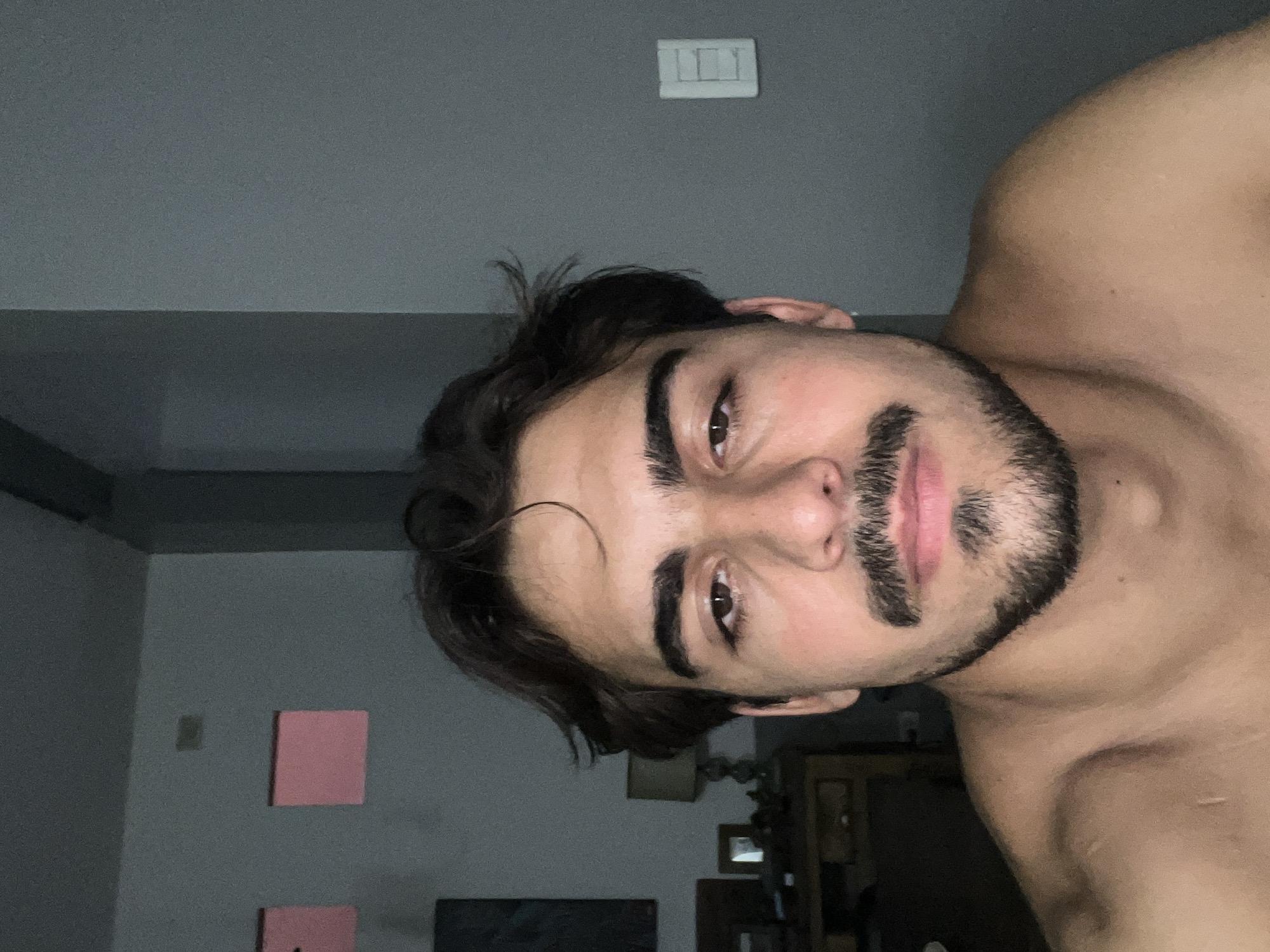 A close-up, indoor shot shows a shirtless man with dark hair, a beard, and brown eyes