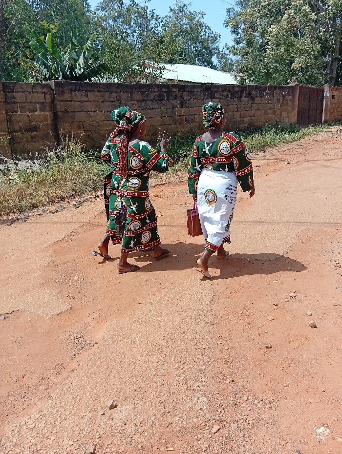 Three individuals, identified as women, are observed walking away from the camera on an unpaved, reddish-brown dirt and gravel road in Jos, Nigeria. They are moving generally from left to right across the frame. All three wear matching traditional Nigerian dresses and head wraps, featuring a green, white, and red pattern with a repeating circular emblem containing a white bird and text, including phrases like "MUKAI WOMEN'S" and "WOMEN'S FING...". The woman on the left raises her right hand with two fingers extended. The woman on the right carries a brown rectangular bag in her left hand and wears an additional white wrapper over her dress, which also features a circular emblem with text. All individuals are wearing sandals. The background consists of a light-colored concrete block wall on the left, a dark metal gate on the right, and dense green foliage from trees and bushes. A building with a light-colored corrugated metal roof is partially visible above the wall and trees in the distance. The scene is illuminated by bright sunlight, casting short shadows and indicating midday.