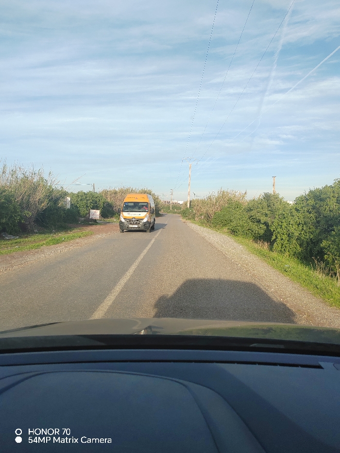 A yellow and white van is driving towards the camera on a two-lane road. The road is flanked by green vegetation and utility poles. The sky is blue with scattered clouds and contrails. The view is from inside a car, showing the dashboard and windshield. A shadow of the car is visible on the road. A watermark indicates the photo was taken with an HONOR 70 54MP Matrix Camera.
