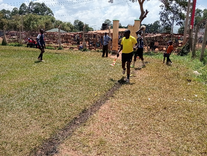 The image displays an outdoor daytime scene in Chevaywa ward, Kenya, featuring a group of individuals on a partially grassed, reddish-brown dirt field under a bright, cloudy sky with visible overhead power lines. In the mid-ground, a male wearing a yellow short-sleeved shirt, black shorts, and dark shoes is running left, holding a small, multi-colored flag or marker in his right hand. To his right, another male in a blue and white striped short-sleeved shirt, black shorts, and dark shoes stands with a light-colored soccer ball held above his head, appearing to prepare for a throw. Further to the right, a male in an orange shirt and dark trousers stands observing the action. On the far left of the mid-ground, a male in a dark blue shirt and dark trousers stands facing right, also observing. The background reveals a wire fence with wooden posts stretching across the frame, behind which are numerous wooden structures, likely market stalls or kiosks, many featuring light-colored roofs. Several indistinct figures are visible among these structures. A male in a light-colored plaid shirt is discernible near the structures on the left side of the background. A red and white striped pole stands vertically on the far right, close to the fence line. Tall green trees are visible in the far background. A diagonal dirt path or worn area crosses the foreground and mid-ground.