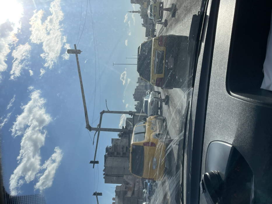 The image depicts a daytime street scene from the interior perspective of a vehicle, looking out through a smudged windshield. The location is an urban road within Joubar Municipality, Syria, under a clear blue sky with scattered white cumulus clouds. Bright sunlight is visible in the upper right quadrant. In the immediate foreground, the dark-colored dashboard of the observer's vehicle is visible, including a small digital display showing "24" and a white object (possibly a tissue) on the passenger side. The road ahead is occupied by multiple vehicles, indicating traffic. Directly in front is a yellow sedan, appearing to be a taxi, with significant damage to its rear bumper area; the license plate is missing, and internal components are exposed. To the left, a yellow minivan or larger van, also likely a taxi, is visible. Further down the road, additional vehicles, including other yellow taxis and light-colored sedans, are present. Several orange and white traffic cones or small barriers line the road, suggesting lane demarcation or ongoing road work. Overhead, traffic light gantries equipped with unlit or non-functioning signal heads span the road, along with numerous overhead utility wires. In the background, multi-story concrete buildings with signs of wear and potential damage are visible. In the far distance to the right, a distinct minaret structure is discernible against the sky, indicating the presence of a mosque. No individuals are clearly identifiable.