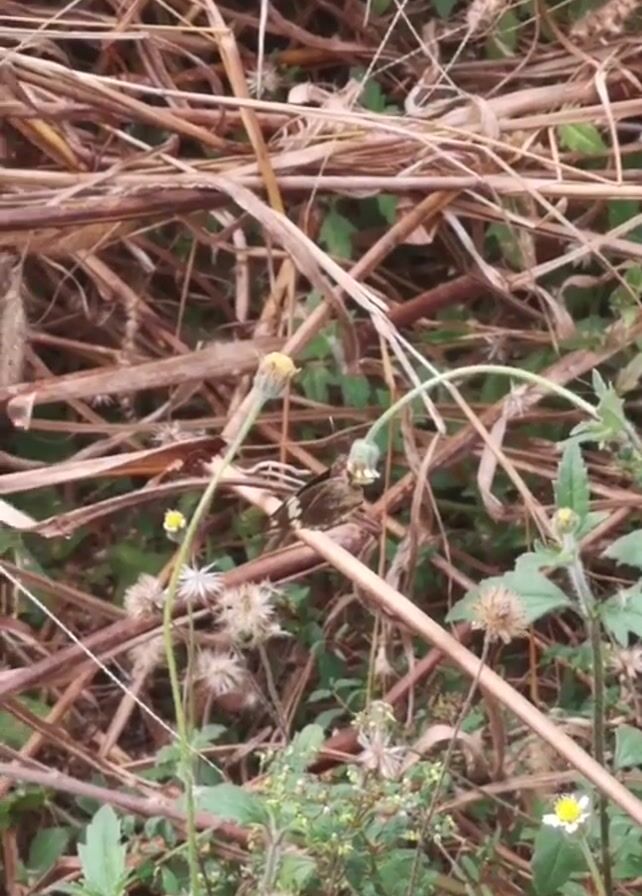 The camera focuses on a natural ground-level scene. Dry, brown twigs and stalks are densely scattered, forming a base layer. Interspersed among the dry material are patches of green vegetation, including leafy plants and thin-stemmed plants with small yellow and white flowers. The camera is slightly out of focus. There are no people present in the video.