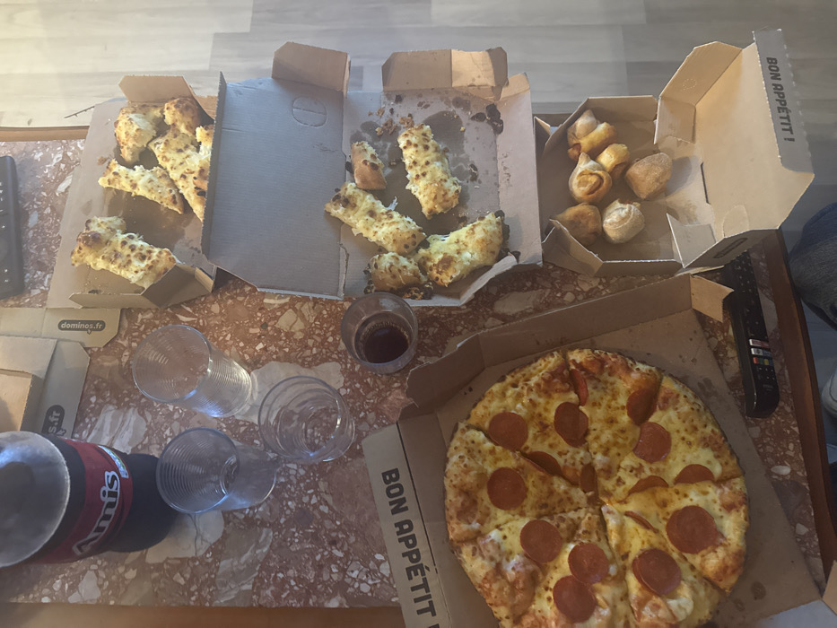An overhead view captures a casual meal setting on a reddish-brown marble-patterned table in Villeurbanne, France. The primary subject is an open cardboard pizza box containing a large pepperoni pizza, several slices of which remain. Adjacent to it are two smaller open cardboard boxes holding partially consumed cheesy breadsticks, with crumbs visible within the boxes. A third small open cardboard box contains multiple cinnamon rolls. Beverages include a partially full dark plastic bottle labeled "Amis Cola" and three clear, ridged drinking glasses, one of which contains a small amount of dark liquid. A smaller, dark glass with minimal liquid residue is also present. A black remote control rests on the table near the pizza box. Elements of other cardboard packaging, one bearing "dominos.fr", are visible in the background. The floor in the background is light grey. No individuals are depicted.