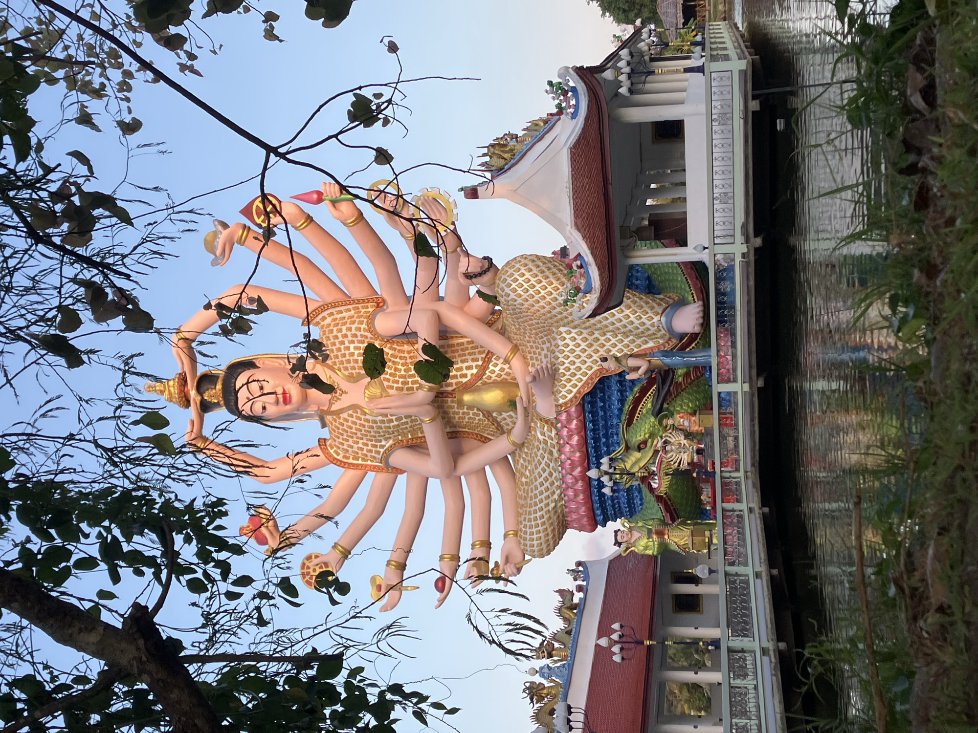The image depicts the statue of Guanyin with eighteen arms, part of the Wat Plai Laem Buddhist temple complex in Baan Plai Laem, Thailand