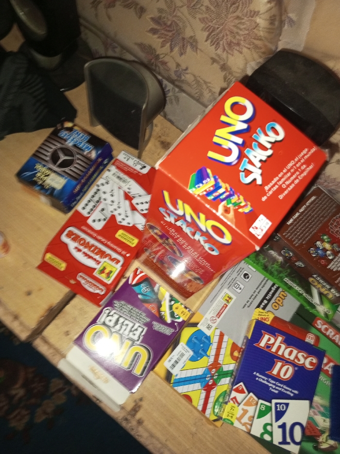 The image displays a collection of various board games stacked on a wooden surface. Prominent titles include Uno Stacko, Uno Flip, Dominos, Phase 10, and Scrabble, suggesting a selection of card and tile-based games. Other board game boxes are also present, though their titles are less distinct. The games appear to be casually arranged, creating an informal setting. The arrangement provides a sense of family fun and leisure activities.