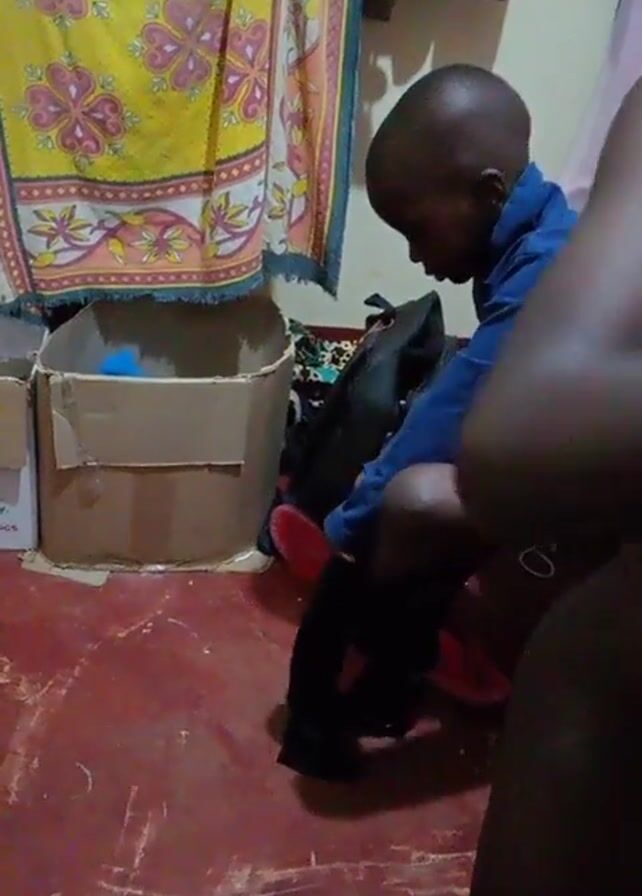 A small child wearing a blue hoodie and black pants sits on a stool and struggles to put on a black sock. The child looks up towards the camera and appears to be crying. They are on a red linoleum floor with two cardboard boxes beside them. A patterned curtain hangs in the background. The arm of an adult is visible to the right of the frame, briefly touching the child’s hair.