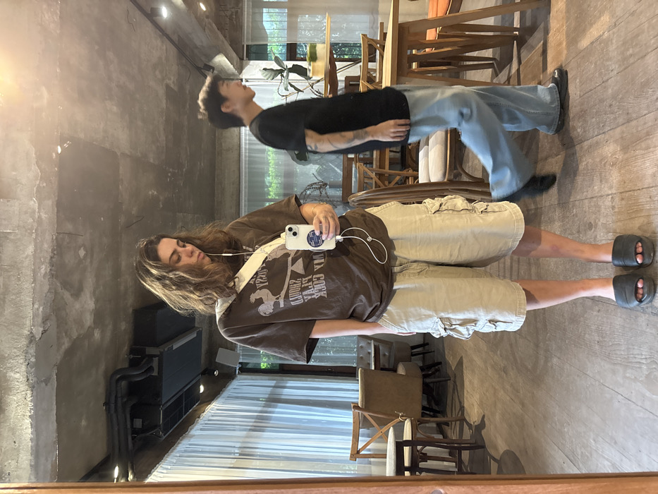 This image depicts the interior of a cafe or restaurant located in Chiang Mai City Municipality, Thailand, as observed through a mirror reflection. In the foreground, a female with medium-length wavy brown hair is seen taking a mirror selfie. She wears an oversized brown t-shirt featuring a graphic of a rooster on a seesaw and mirrored text, which appears to be "SHOULD I PLAY MY COCK?". She is also wearing tan cargo shorts, dark grey slip-on sandals, and has a white cross-body strap holding her white smartphone, to which white wired earphones are connected and in her ears. Her hands are partially in her pockets, with one hand holding the phone. In the background, a second individual, a male with short dark hair and visible tattoos on his left arm, is walking from left to right. He is dressed in a black t-shirt and light blue wide-leg jeans, with dark shoes. His movement results in a slight blur. The environment features a light brown wooden floor and an exposed grey concrete ceiling with visible black air ducts and recessed lighting. The left side of the room has large windows covered by sheer white curtains, allowing natural light to enter. Various wooden tables and chairs, along with some upholstered lounge chairs in muted tones, furnish the space. Potted plants are visible near the windows, contributing to the cafe's decor.