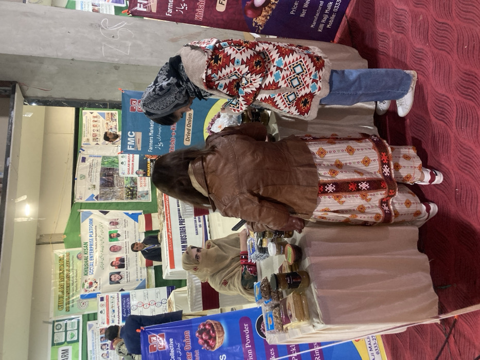 This image depicts an indoor agricultural and food product exhibition or market event in Quetta City Tehsil, Pakistan