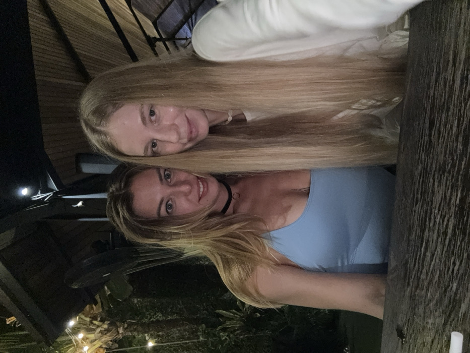 Two adult females are positioned in a close-up, head-and-shoulders portrait shot, smiling directly at the camera. The woman on the left has light-colored, wavy hair reaching her shoulders, wears a light blue tank top, and a black choker necklace with a small circular pendant. A faint linear tattoo is visible on her upper left chest. Her eyes are wide. The woman on the right has very long, straight blonde hair, wears a white long-sleeved top, and a light-colored beaded choker necklace. Both subjects are light-skinned. They appear to be seated at a dark, textured wooden table that occupies the lower portion of the frame. The background is dimly lit, revealing tropical foliage with string lights on the left, and dark overhead structures with embedded lights and a partial view of a fan on the right. The setting suggests an outdoor or semi-outdoor evening establishment, such as a restaurant or bar in Unknown, Unknown.