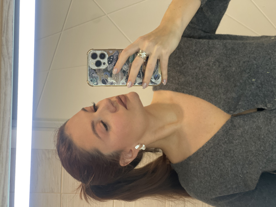 A woman takes a mirror selfie. She holds a phone with a celestial-themed case in her right hand. She wears a gray, button-down sweater and white flower-shaped earrings. Her hair is pulled back. She has a ring on her right index finger. The background includes a mirror with a light on one side and wall tiles.