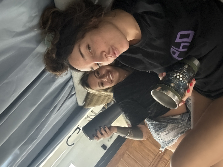 Two young adult females are depicted in a selfie taken indoors in Thong Sala, Thailand